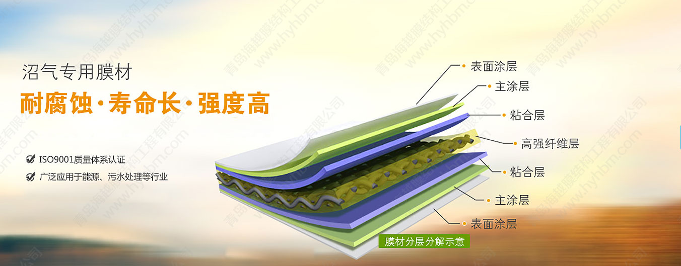 為了滿足這些功能,青島海越的雙膜氣柜(沼氣柜)的內(nèi)膜首先就選擇有耐氣體介質(zhì)腐蝕和溶解能力的沼氣專用膜材。沼氣的泄漏量也要完全符合國際標準。